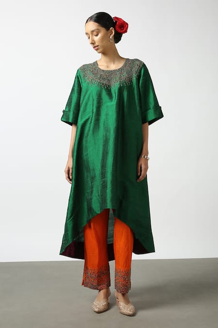 Green Raw Silk Embroidery Glass Bead Round Tunic