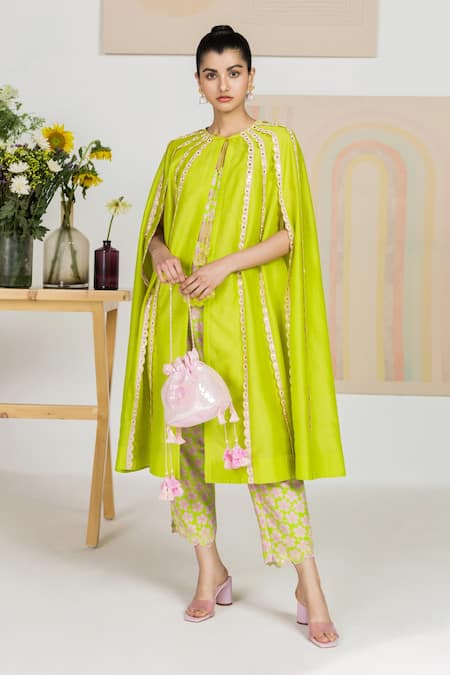 Green Crop Top Pant Cape Silk Floral Print, Set