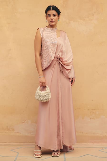 Pink Polyester, Satin Sequins, Embroidery Irvine Jacket And Pre-draped Saree Set