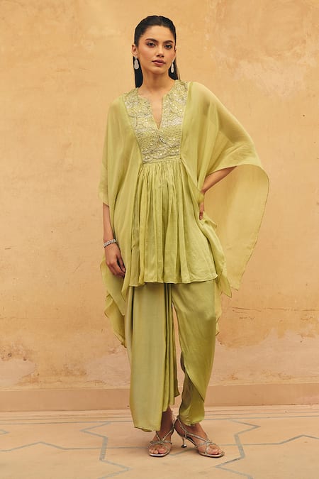 Green Organza, Satin Sequins, Beads, Embroidery Naira Hand Kaftan Top Pant Set