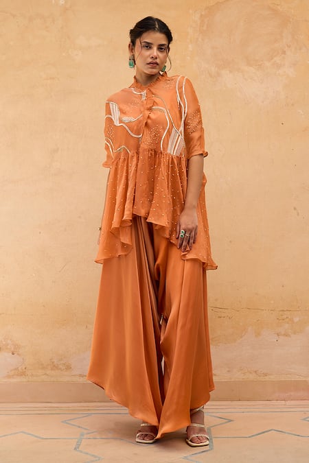 Orange Satin, Organza Embroidery, Sequins Zuri Abstract Hand Overlay Pant Set