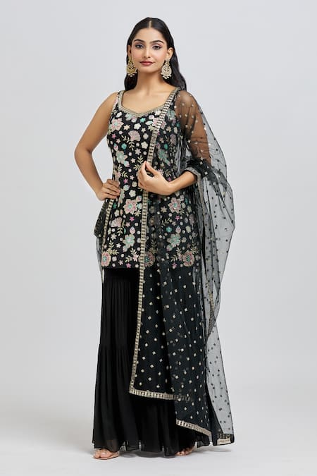 Black Kurta And Sharara Georgette Embroidery Sequin Tear Floral Blossom Set