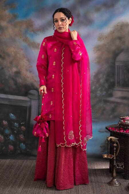 Pink Chanderi Silk, Kota Doria, Floral Embroidered Pattern Kurta Palazzo Set