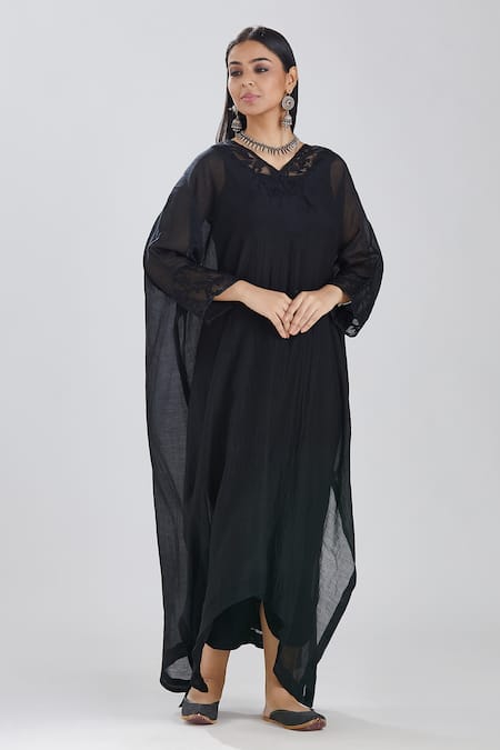 Black Organza, Chanderi Floral Pattern V Ambreen Kaftan And Pant Set