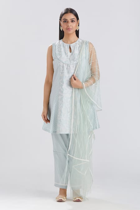 Blue Tulle, Silk Chanderi Dori, Sequin And Bead Ida Embroidered Kurta Pant Set