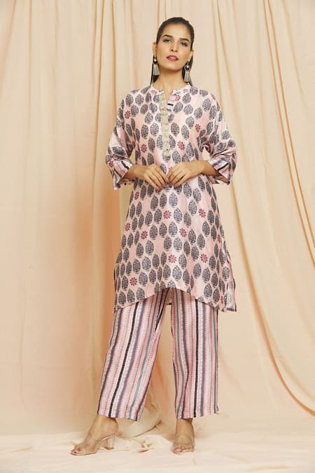 Pink Silk Embroidery Mandarin Collar Mughal Print Kurta With Pant