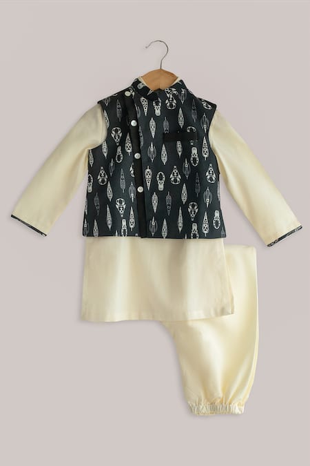 Black Cotton, Silk Abstract Printed Bundi Kurta Set