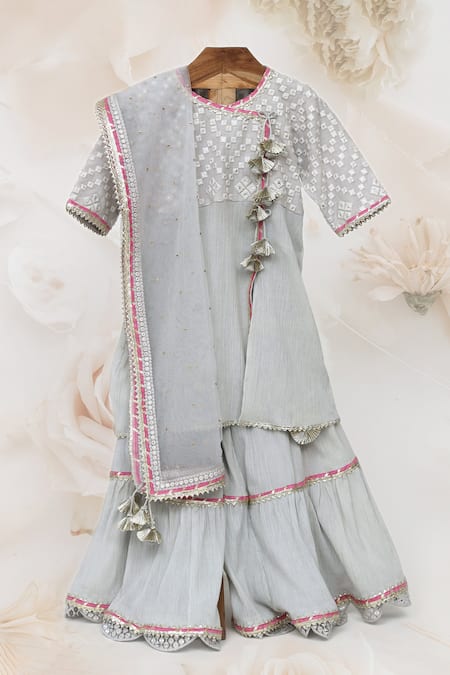 Grey Cotton Tassels, Cut Work Mirror Embroidered Kurta Sharara Set