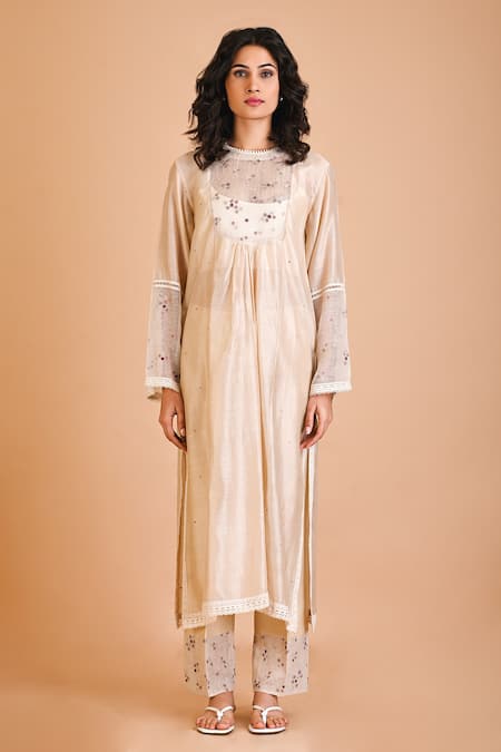 Ivory Silk, Chanderi Embroidery Round Neck Cactus Floral Tunic Set