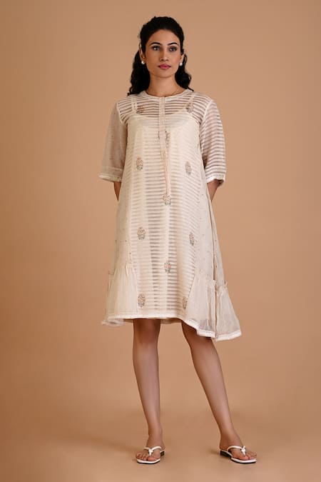 Ivory Jute Silk Hand Embroidered Floral Round Clove Dress With Inner