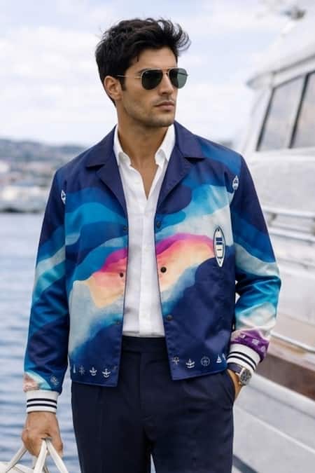 Blue Cotton Satin, Lycra Seafarer Print Double Breasted Blazer