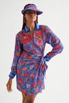 Blue Satin Sequins, Embroidery Collared Floret Print Wrap Dress