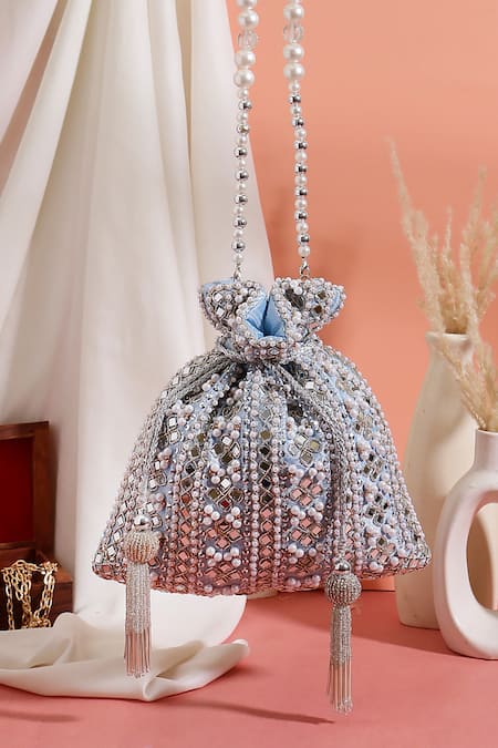 Sky Blue Pearls, Beads, Mirrors, Tassels And Embellished Potli Bag