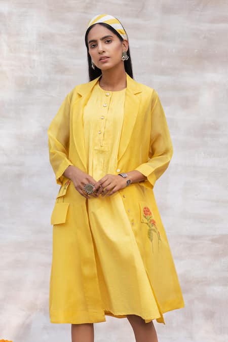 Yellow Organza, Handloom Dress Dress Round Jacket Collar Pintuck With