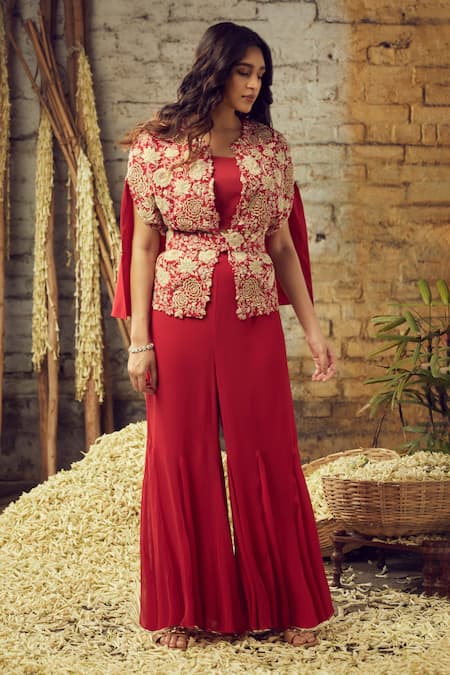 Red Georgette, Silk And Cotton Lycra Thread, Floral Embroidered Cape & Sharara Set