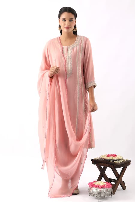 Pink Organza, Modal, Chanderi Silk Miniature Floral Kurta Dhoti Pant Set