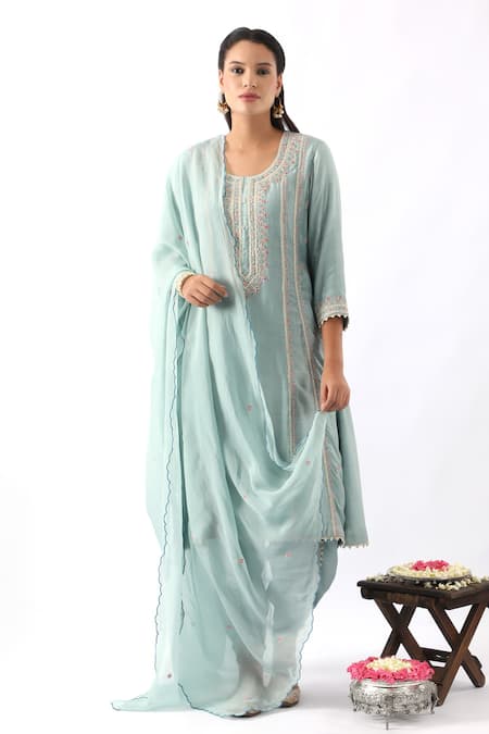 Blue Organza, Modal, Chanderi Silk Miniature Flower Kurta Dhoti Pant Set