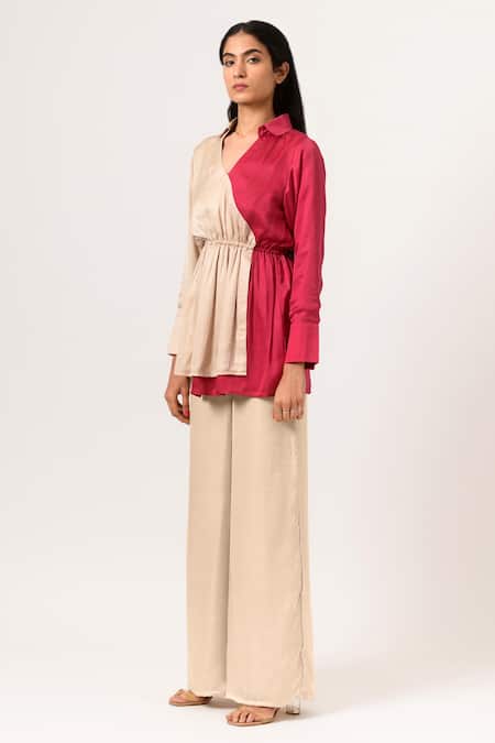 Beige Sustainable Silk Collared Neck Color Block Top And Pant Set
