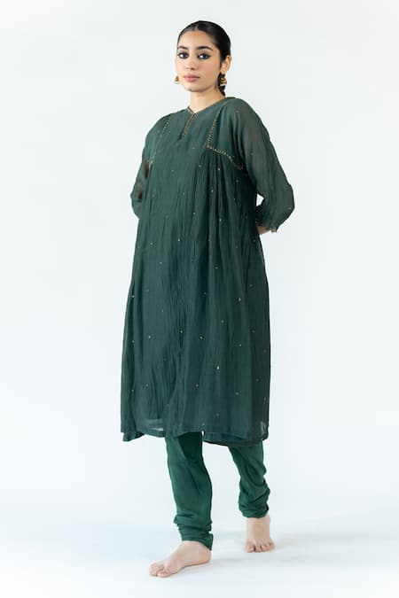Green Chanderi Cotton, Cotton, Silk Embroidery Round Arsh Kurta And Churidar Set