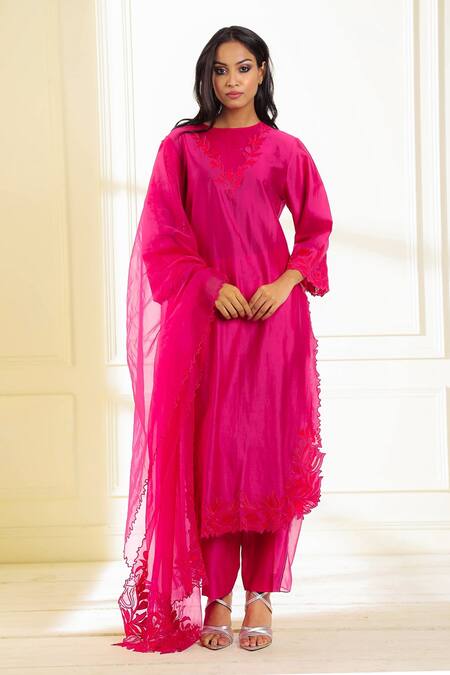 Pink Chanderi, Organza Applique, Cut Shahin Placement Embroidered Kurta Set