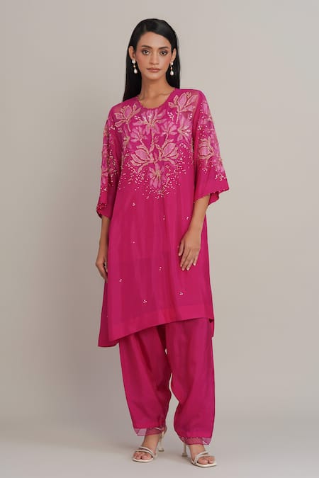 Pink Silk, Organza, Satin Applique, Sequins, Beads, Floral Kurta And Salwar Set