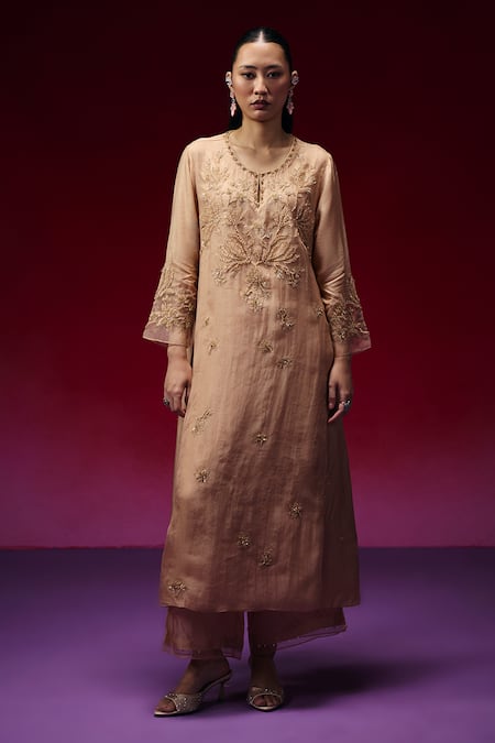 Gold Silk Applique, Sequins, Beads, Crystals, Floral Kurta And Pant Set