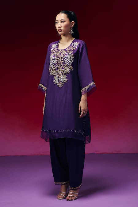 Purple Silk Sequins, Beads, Crystals, Embroidery Hand Yoke Kurta And Salwar Set