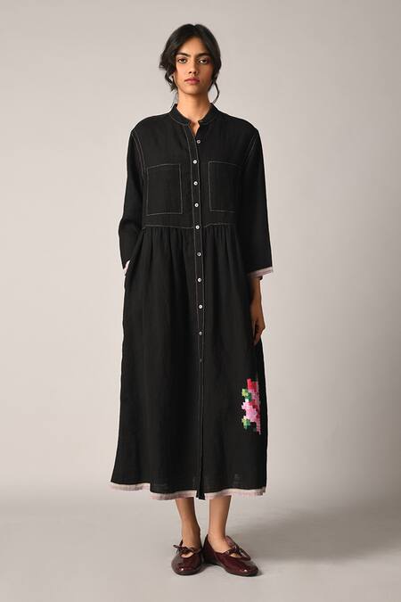 Black Handloom Cotton Embroidery Collared Bella Applique Dress