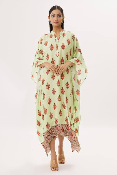 Green Cotton Silk Floral Mandarin Collar Print Kaftan