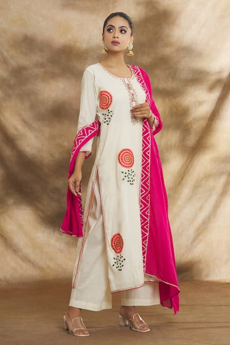Off White Cotton Tassels, Embroidery Round Neck Resham Kurta Pant Set