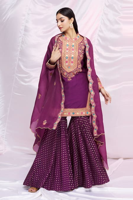 Purple Cape Organza, Sharara Brocade Floral Motifs, Mirror Work Cape Set With