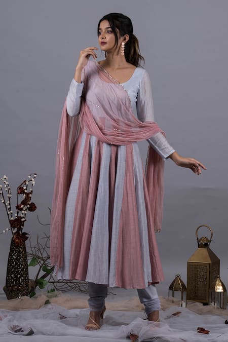Blue Tulle, Linen, Silk Sequins Round Neck Alternate Panelled Flare Anarkali Set