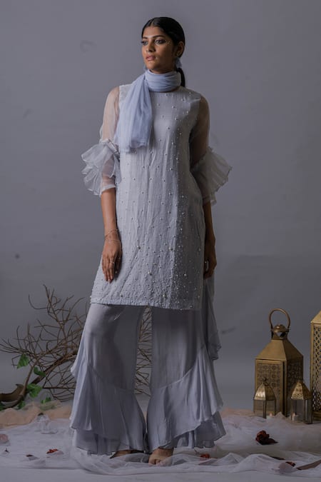 Blue Modal Silk Embroidery Pearl Round Neck Meadow Embellished Kurta Set