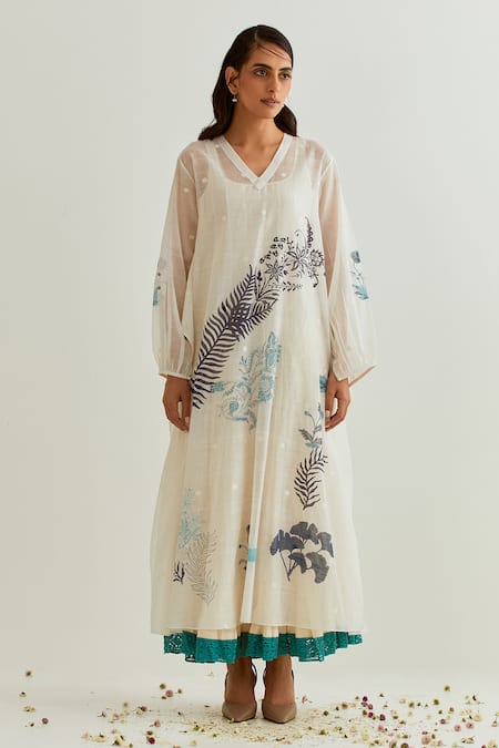 Prama By Pratima Pandey Ivory Chanderi Embroidery V-neck Block Print Dress With Inner