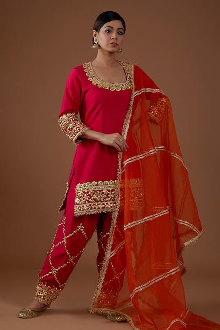 Pink Silk, Organza Gota Patti, Sequins, Pearls, A-line Kurta Salwar Set