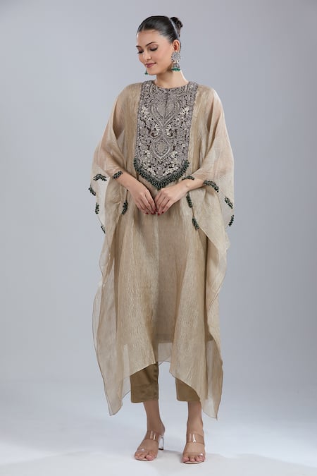 Gold Beads Round Neck Yoke Embroidered Kaftan And Pant Set