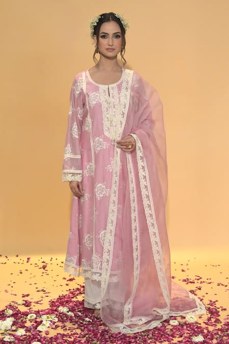 Blush Chanderi Cotton, Cotton, Organza Embroidery, Lace Pink A Line Kurta Set