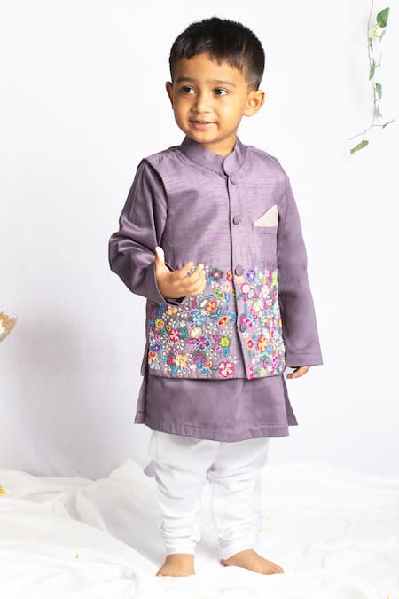 Purple Bamboo, Cotton, Silk Beads, Embroidery Floral Bundi Kurta Set