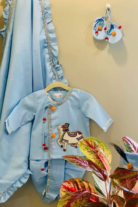 Blue Cotton, Silk Embroidery Kaamdhenu Cow Kurta And Dhoti Pant New Born Set