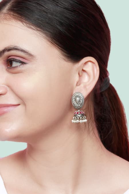 Silver Plated Pearls, Stones Tribal Oval Shaped Jhumkis