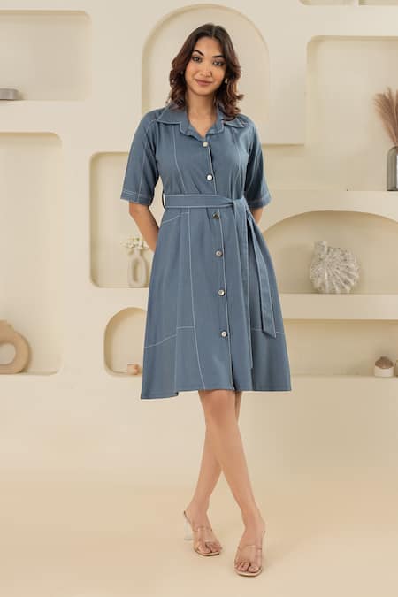 Blue Cotton, Denim Collared Dress With Belt