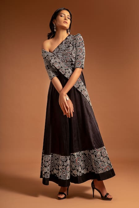 Black Pure Satin Crepe Embellished Rhinestone Ajrak Yoke Anarkali