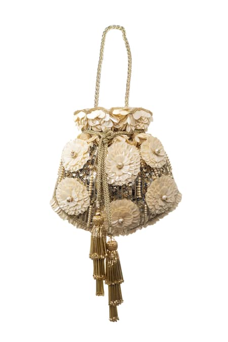 Gold Sequins, Beads, Applique, Tassels Floral Embroidered Potli