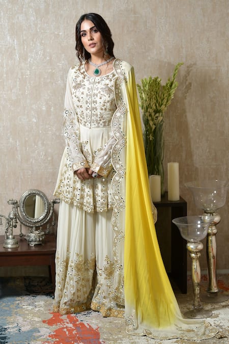 Buy_Shian_Beige Georgette Zardozi Round Embroidered Peplum Sharara Set _Online_at_Aza_Fashions