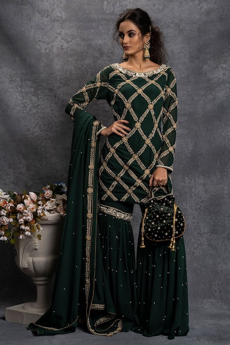 Green Georgette Zari Boat Moti Embroidered Sharara Set