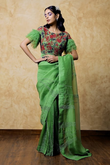 Green Organza Beads, Embroidery Boat Neck Saree With Abstract Blouse