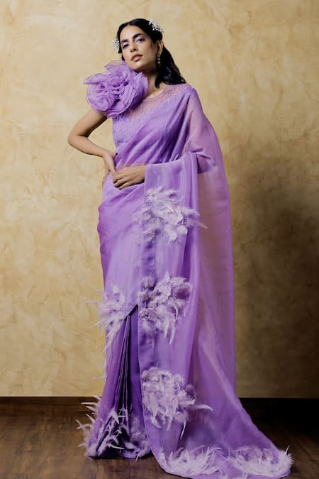 Purple Organza Feathers, Sequins Round Neck Embroidered Saree With Blouse