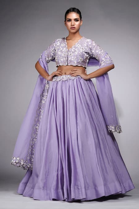 Purple Silk, Organza Pearls, Zari, Lehenga And Floral Embroidered Blouse Set
