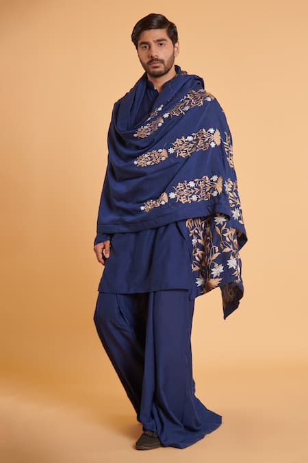Blue Linen Solid Kurta With Flap Attached Pant