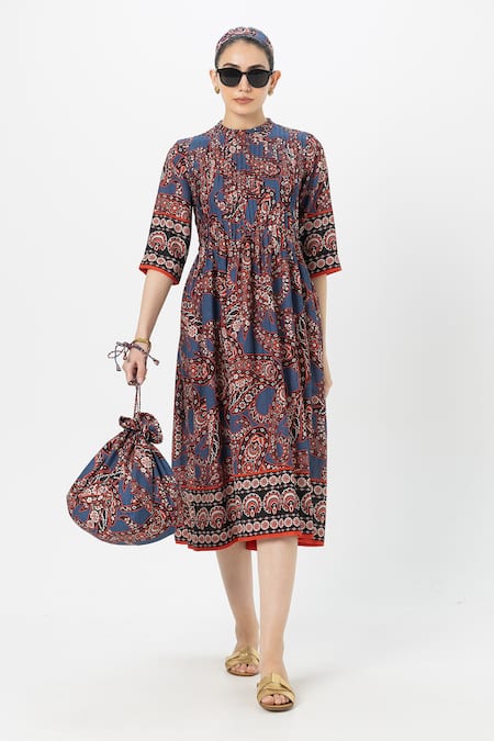 Blue Linen Round Neck Deniz Pleated Midi Dress